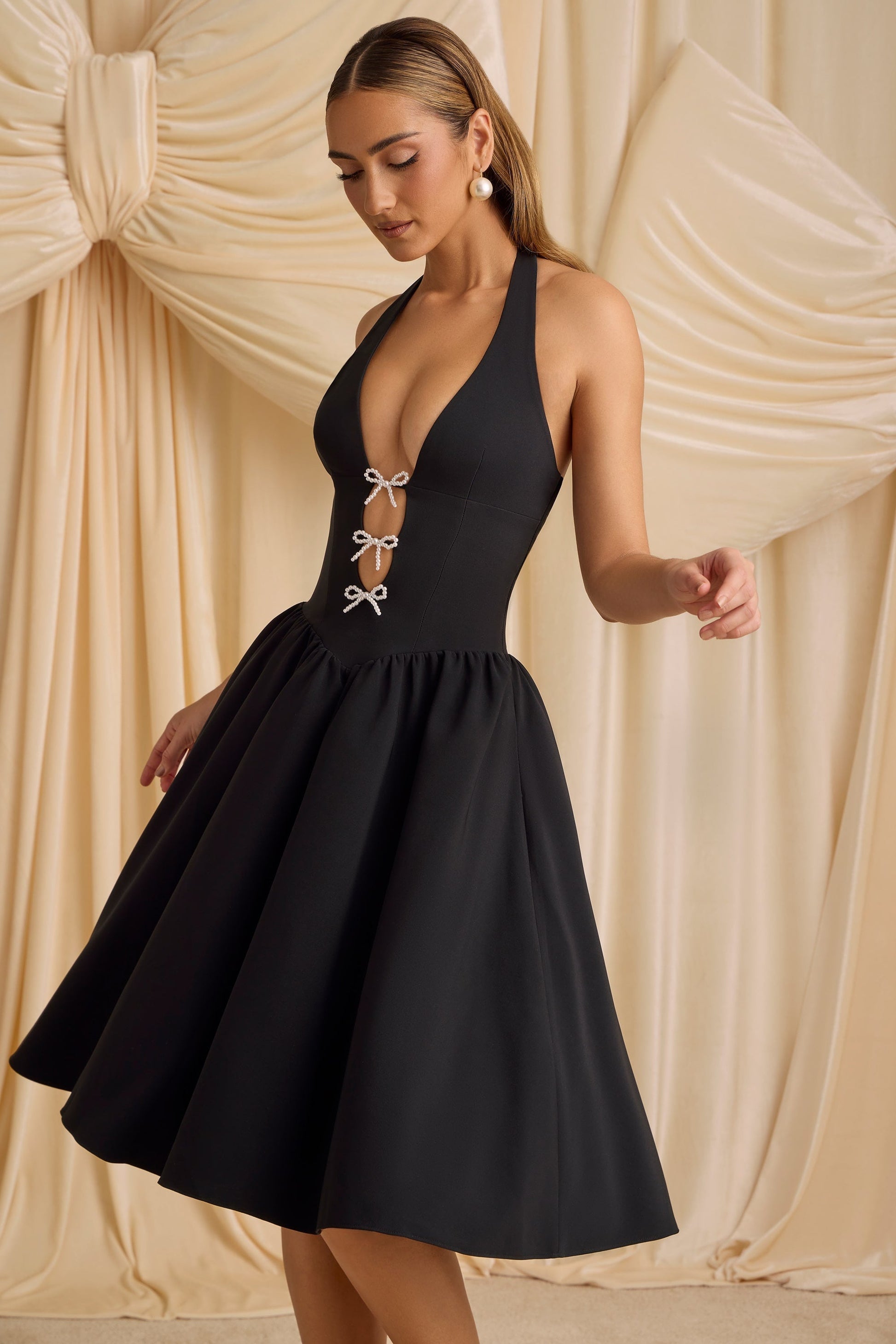 Want to stand out at any celebration? Meet the Angelina midi dress. Crafted from premium stretch woven fabric that hugs every curve, it’s cut to a classic halterneck silhouette with a fitted drop-waist bodice and voluminous gathered skirt. The plunge neckline is traced with a trio of pretty faux-pearl bows for maximum impact at your next event.