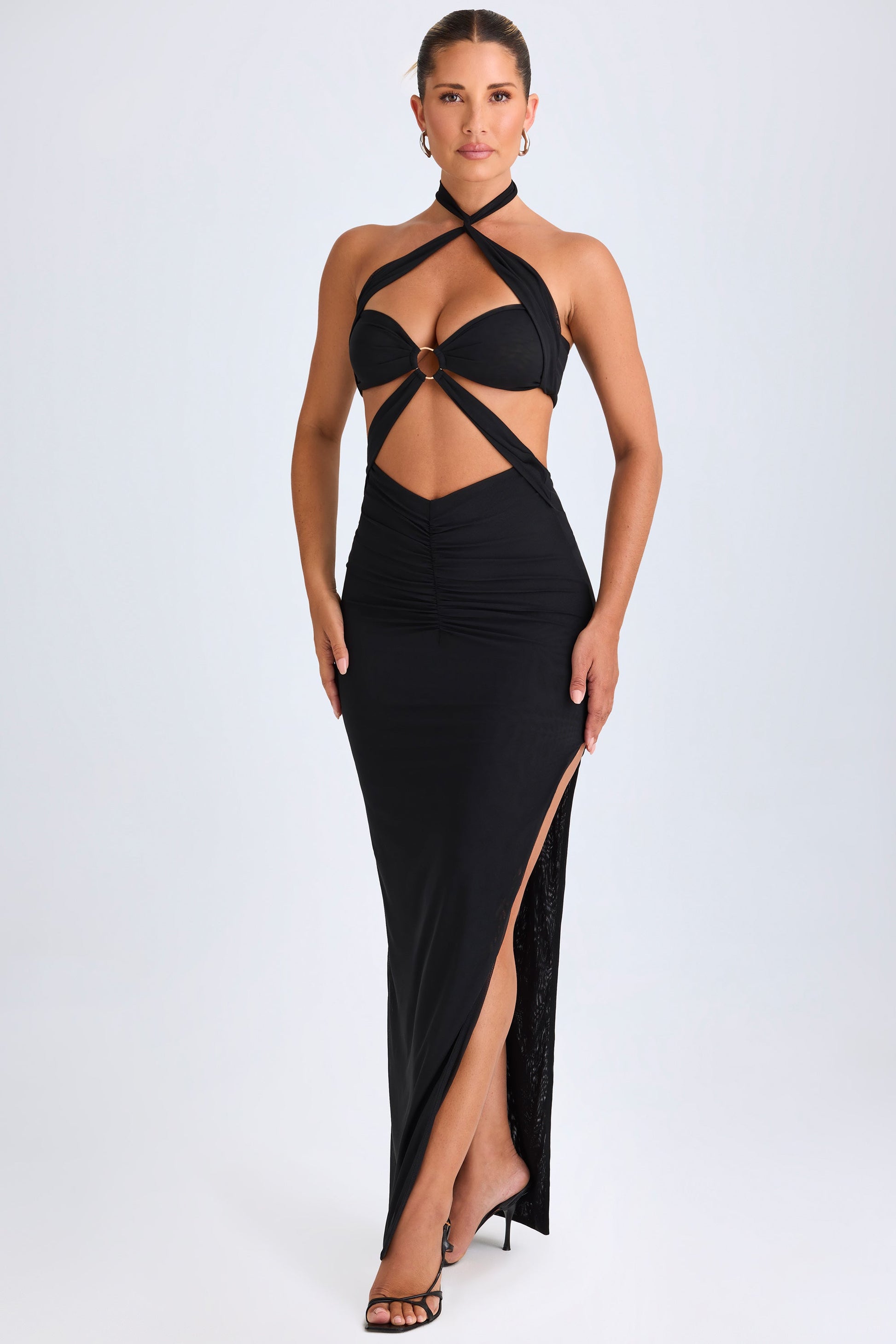 Classic silhouettes, signature details. A statement design for balmy evenings, the Bethania maxi dress is crafted from premium 20D stretch mesh to a halterneck silhouette with subtle ruching. It’s punctuated with striking cut-outs at the waist that create a contoured look and secured with polished O-ring hardware at the front. It’s complete with a sultry cut-out back and a thigh-high side split.