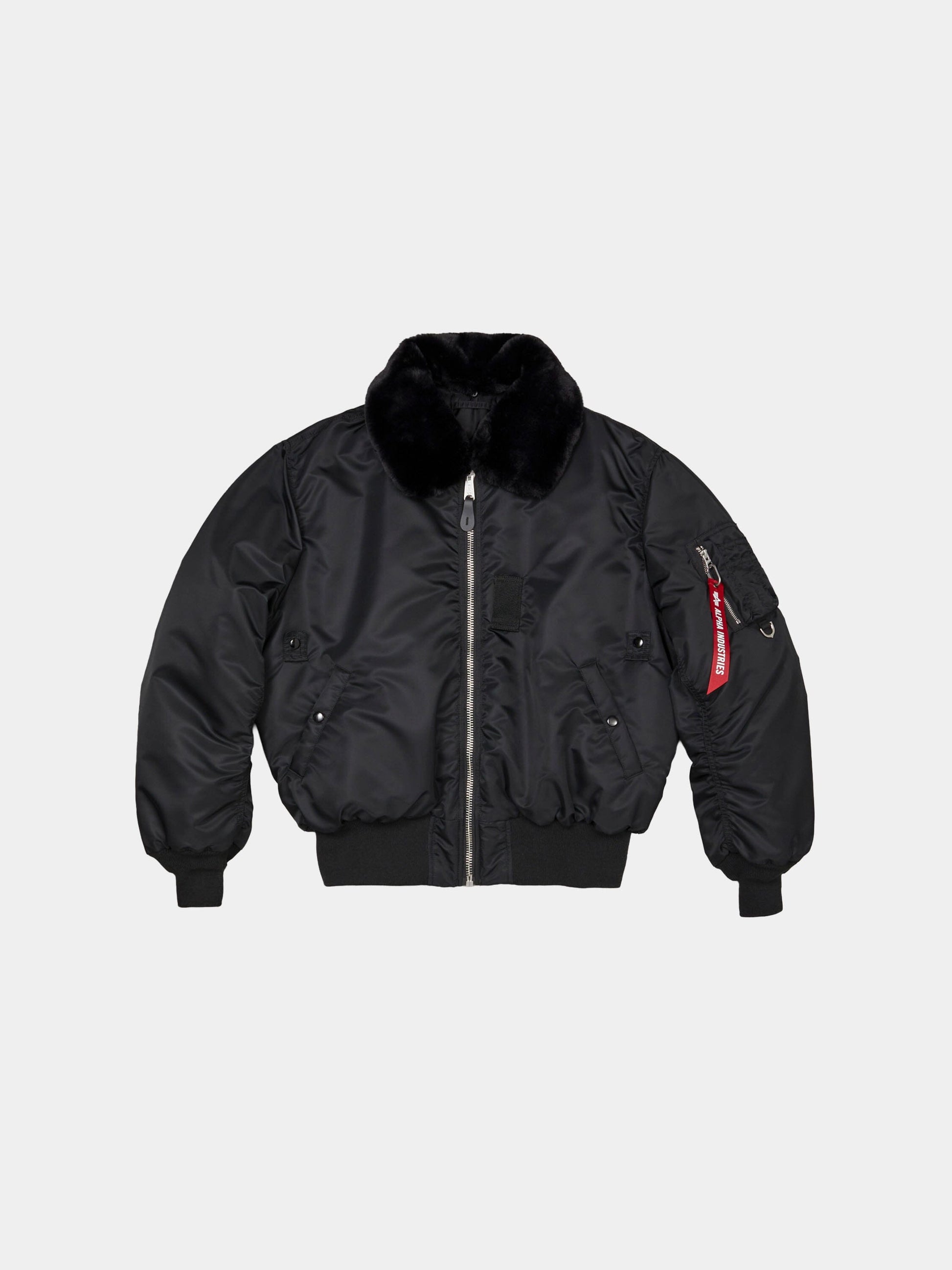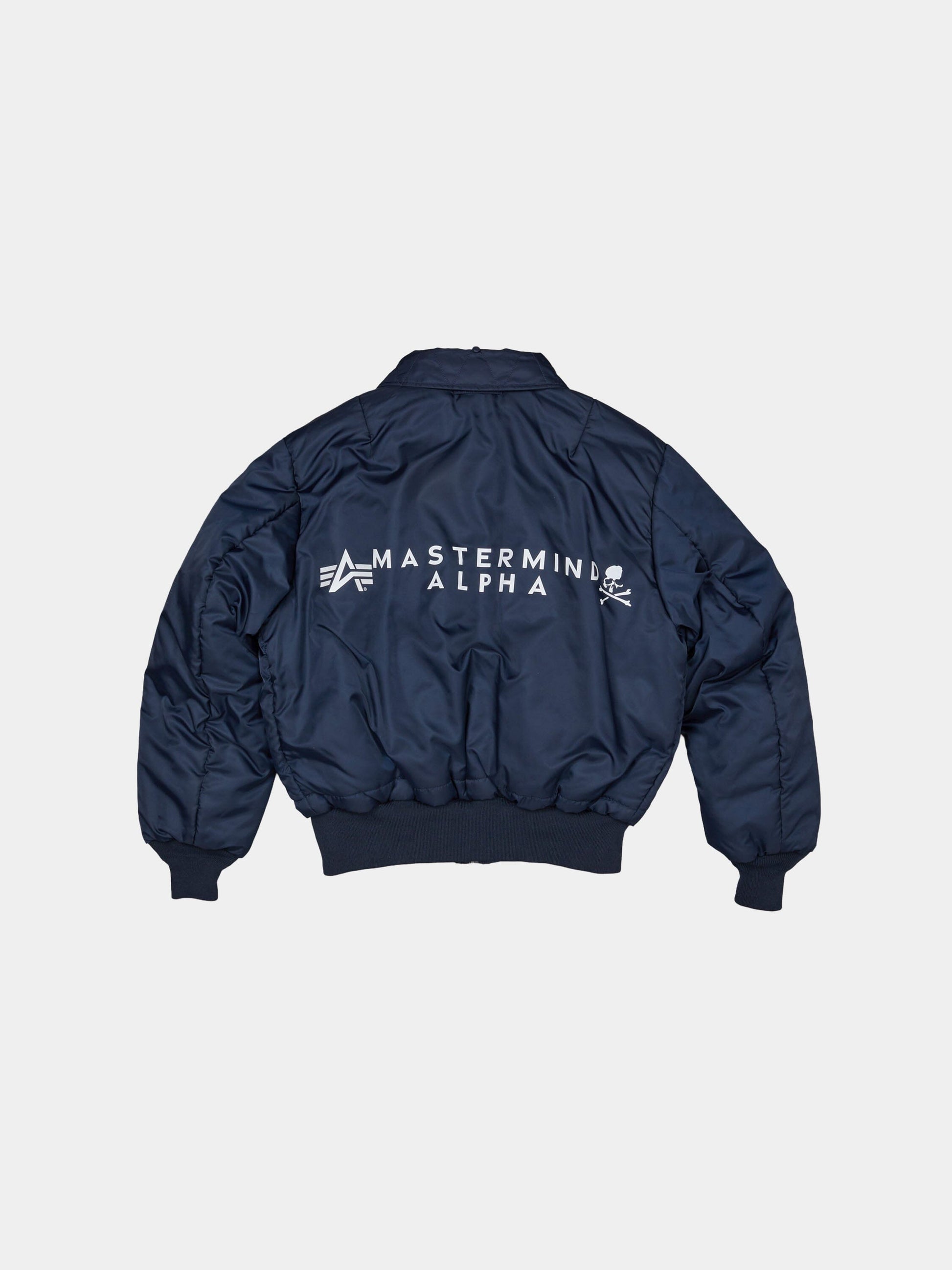 A modern reinterpretation of a historic U.S. Air Force silhouette originally produced by Alpha Industries’ predecessor, Dobbs Industries, in the 1950s. Constructed from durable flight-weight nylon with a faux-fur mouton collar and Mastermind’s skull-and-crossbones logo rendered in faux mouton fur across the back. The reversible side features the bold “MASTERMIND ALPHA” collaboration logo. Additional details include Alpha’s signature utility sleeve pocket and “Remove Before Flight” ribbon.