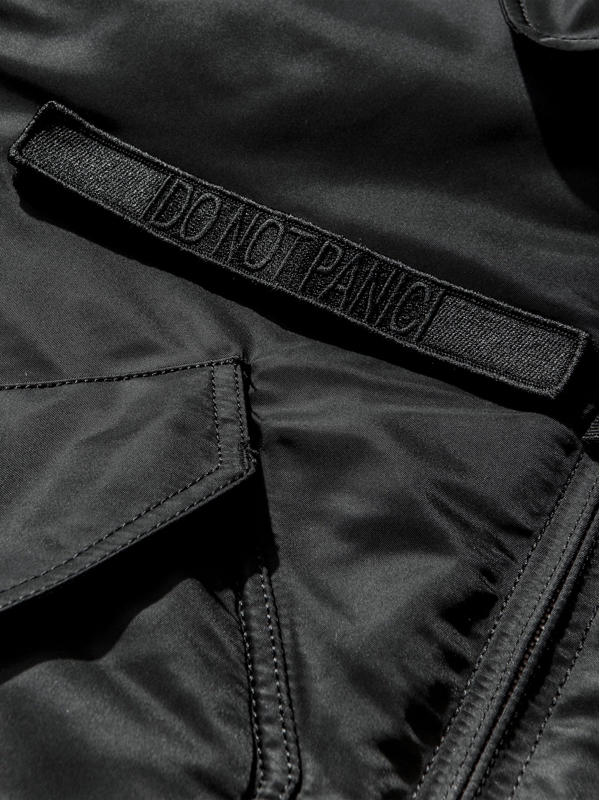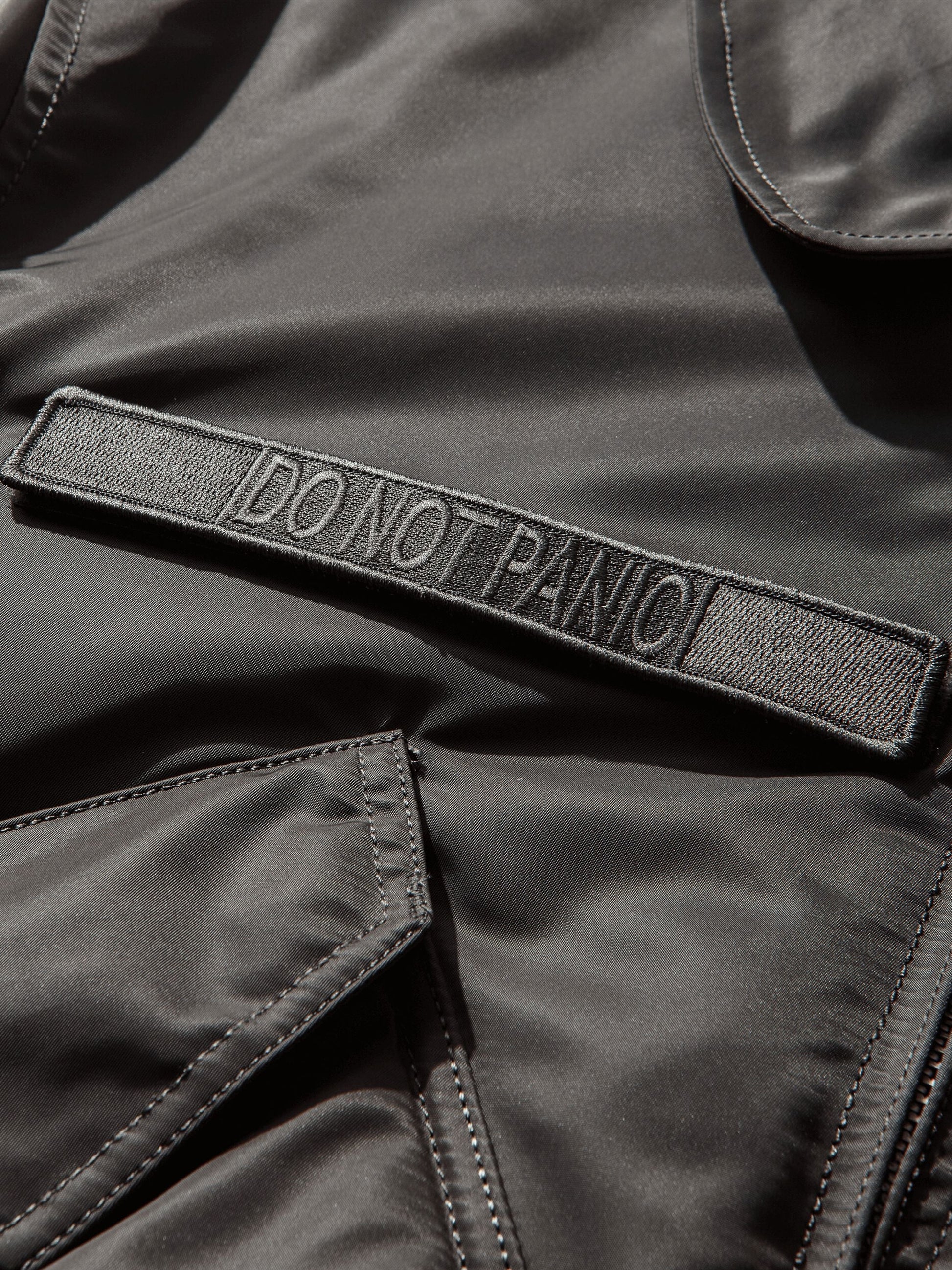 The SLAM JAM X ALPHA CWU-45 CHAOS FLIGHT JACKET features removable patches that read Chaos Is Order, 1989, and Do Not Panic—statements that belong halfway between instruction and philosophy. The slogans act like mission badges for a different kind of flight.