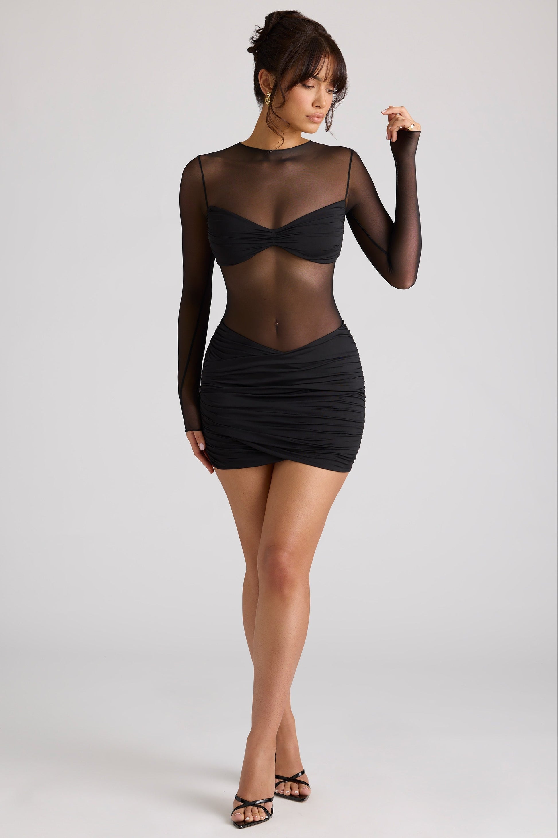 Sheer Panelled Long Sleeve Mini Dress in Black