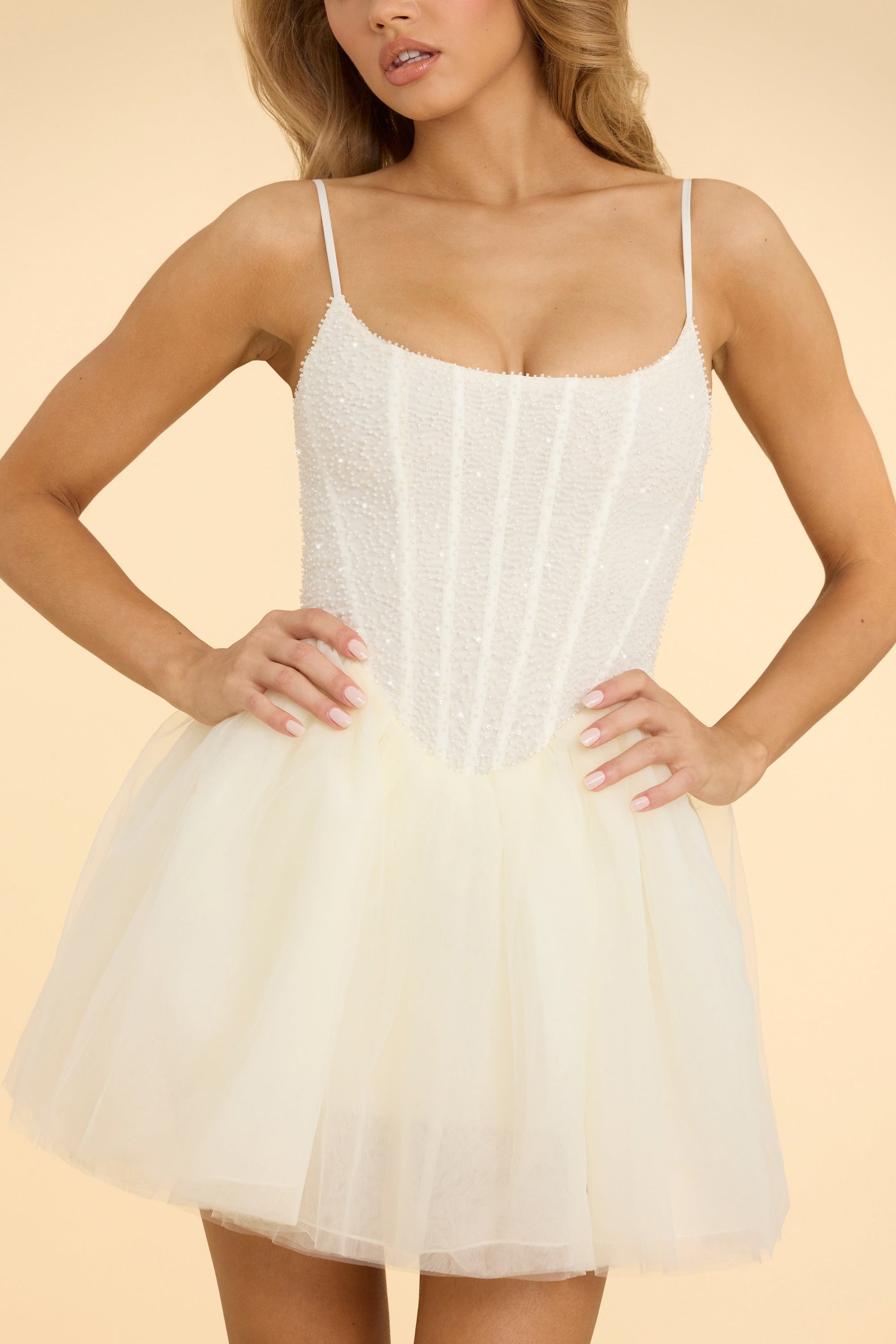 Live out your fairytale era. An enchanting silhouette perfect for memorable evenings, the Eugenie mini dress features a built-in corset that works to sculpt and support your frame. Designed with a power mesh corset base that’s fully embellished with hand-sewn beading, Eugenie is complete with a voluminous tulle skirt.