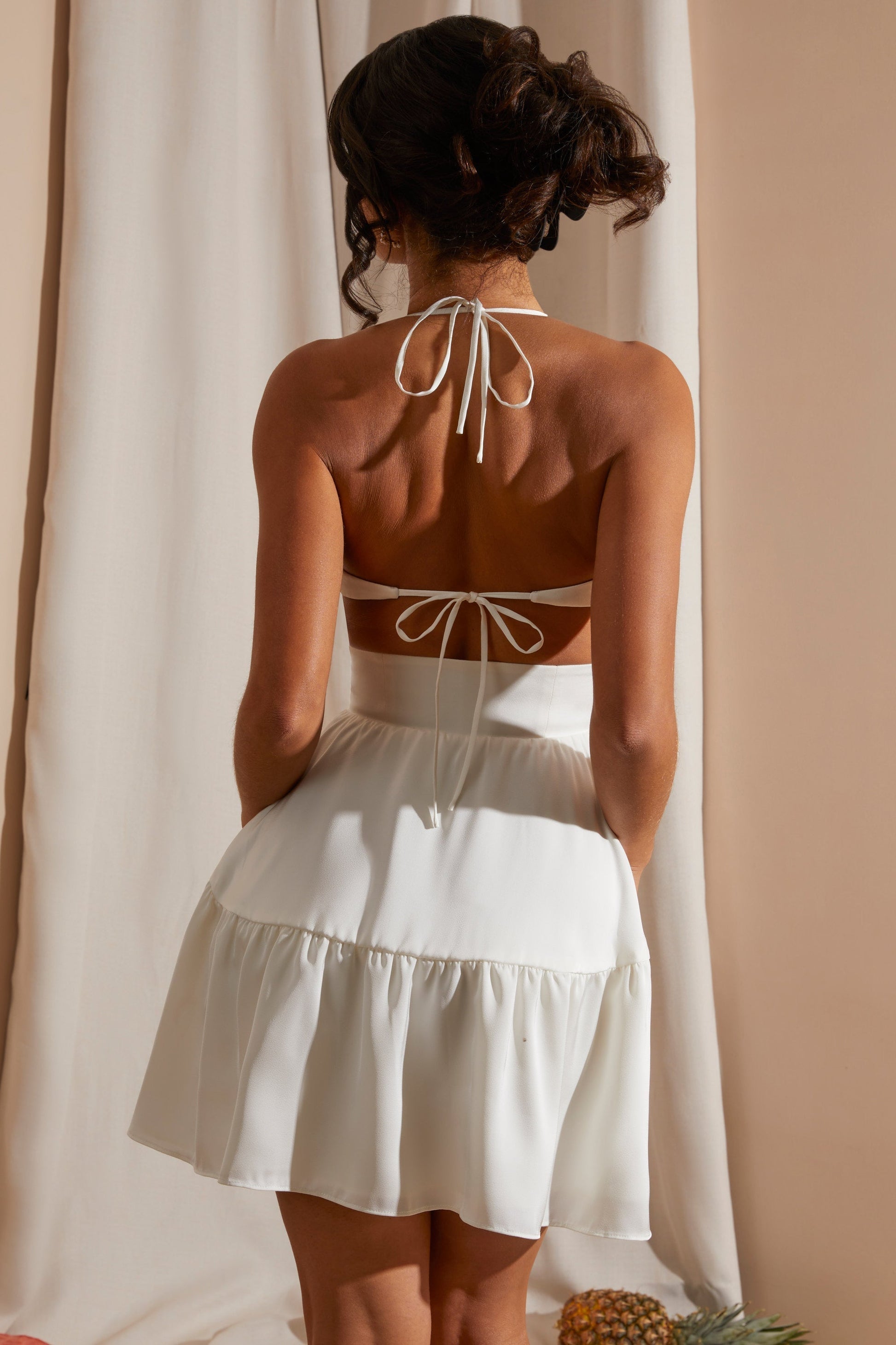 Fleur is a romantic style designed to captivate any room. Made from our premium lightweight satin fabric, the Fleur mini dress features a bodycon bodice with a lightly curved halter neckline that accentuates the bust. The curved hemline works to accentuate your shape where the paneled mini skirt gathers before falling in delicate and whimsical pleats. Complete with side cut outs that extend across the back, the Fleur mini dress is a romantic piece for your eventwear wardrobe.