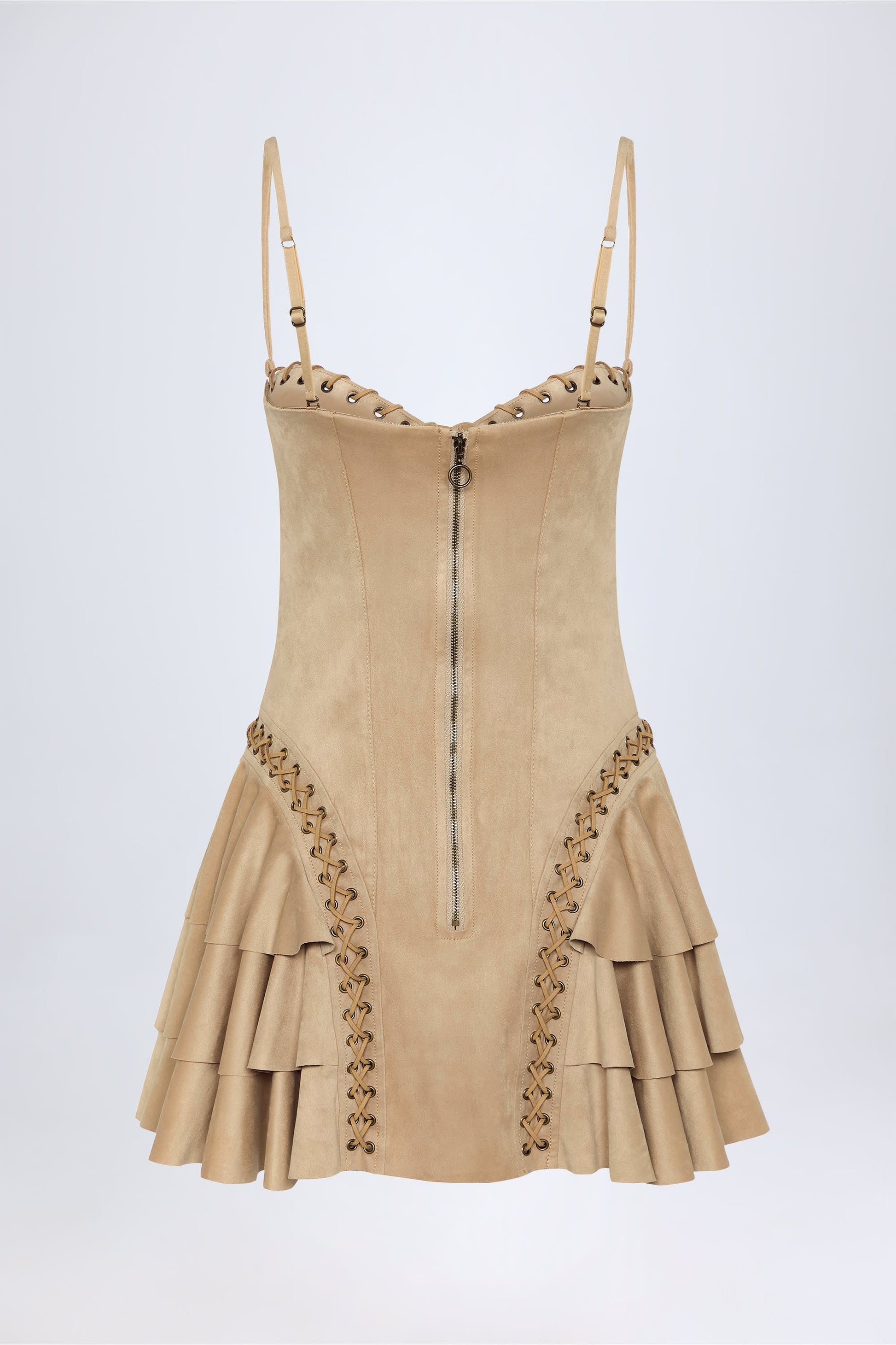 Western spirit. Perfect for summer dressing and festival season, the Hendrix mini dress is crafted from premium, soft-touch faux suede with a supportive corset bodice, complete with ruched moulded cups, and features a flared mini skirt with a dynamic tiered design. It’s elevated with tonal topstitching, decorative eyelets and lace-up detailing that brings the aesthetic to life.