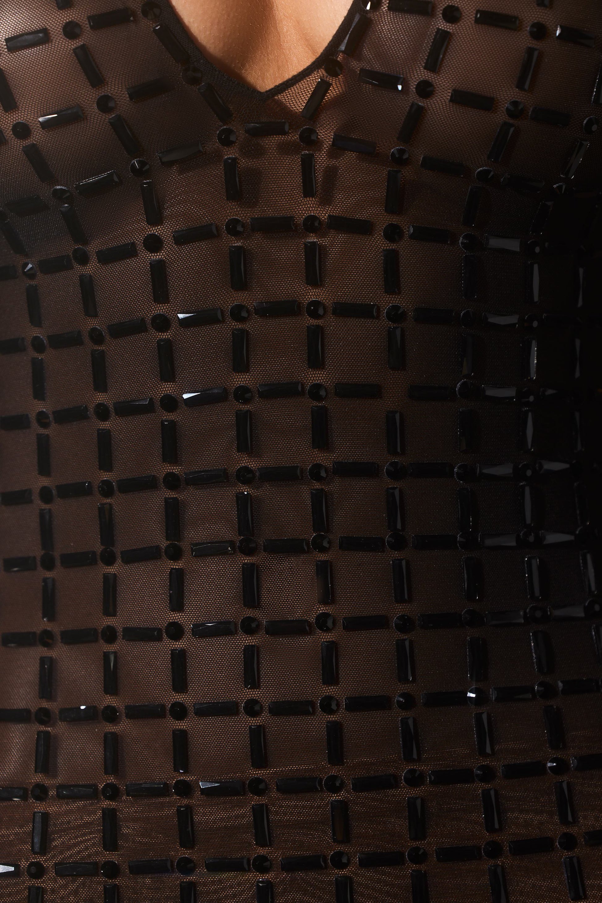 Modern glamour meets elevated design with the Ilana mini dress. A semi-sheer design crafted from premium 40D power mesh, it’s cut to a figure-skimming A-line silhouette and saturated with custom HOTFIX embellishments arranged in a grid-like pattern for high-impact sparkle. It features a keyhole cut-out at the front mirrored with an open back and darts at the bust for enhanced shaping.