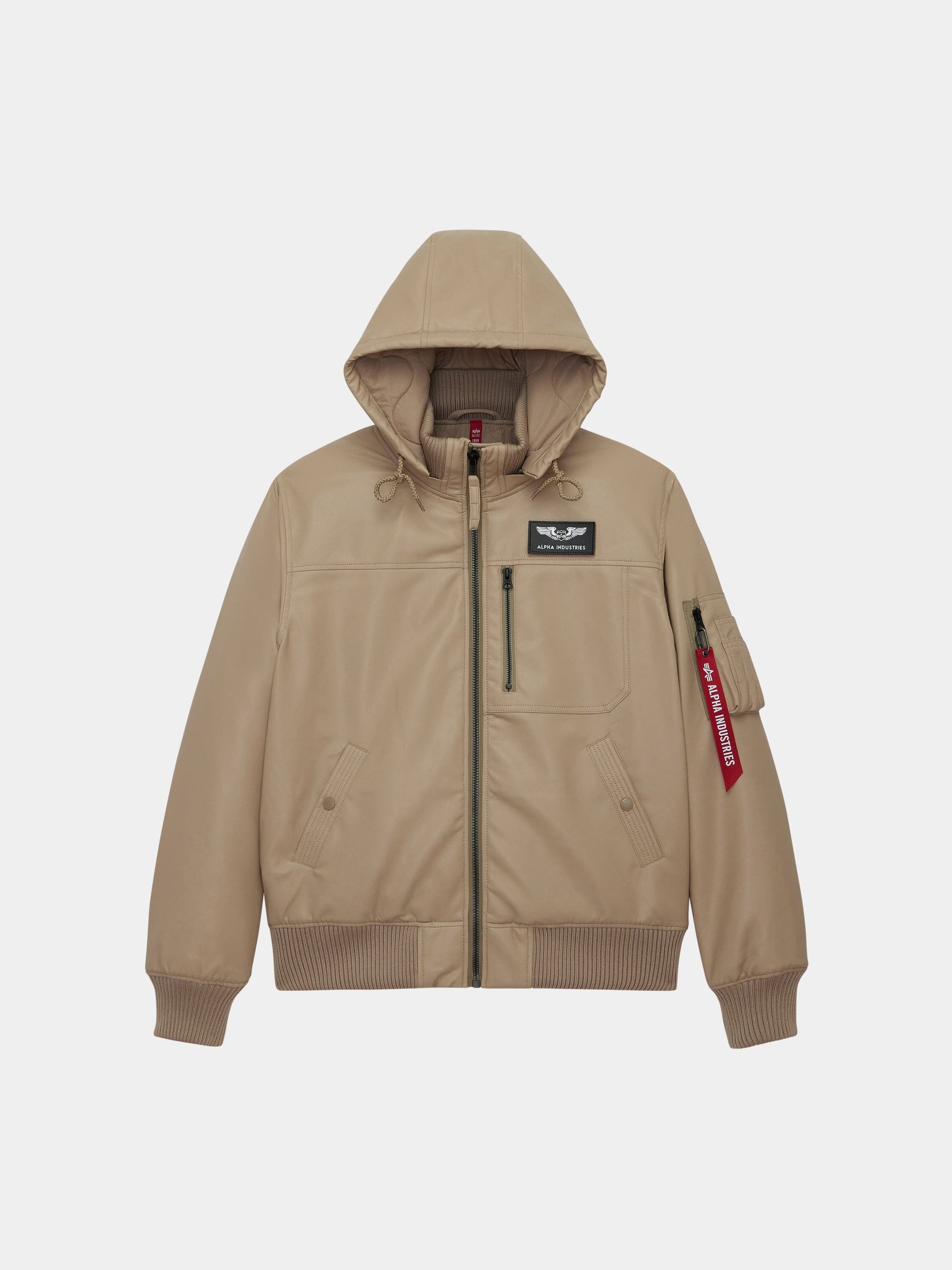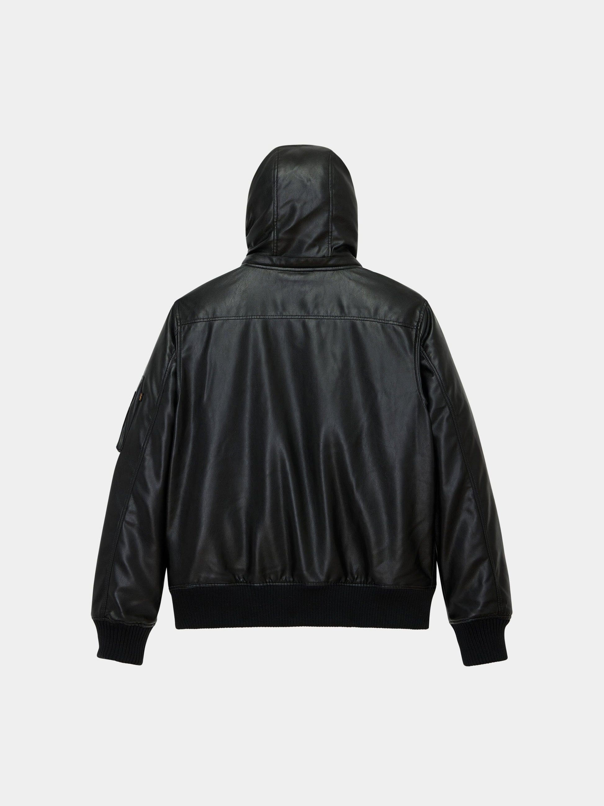The Faux Leather Hooded Rib Flight Jacket offers a bold take on a classic silhouette. This versatile style features rib knit hem, cuffs, and collar for a structured look. A hood with adjustable drawcord enhances comfort, while two welt pockets and a utility sleeve pocket with the signature red ribbon add utility. Finished with embroidered patches on the chest and sleeve, this jacket blends heritage aviation design with a street-ready edge.