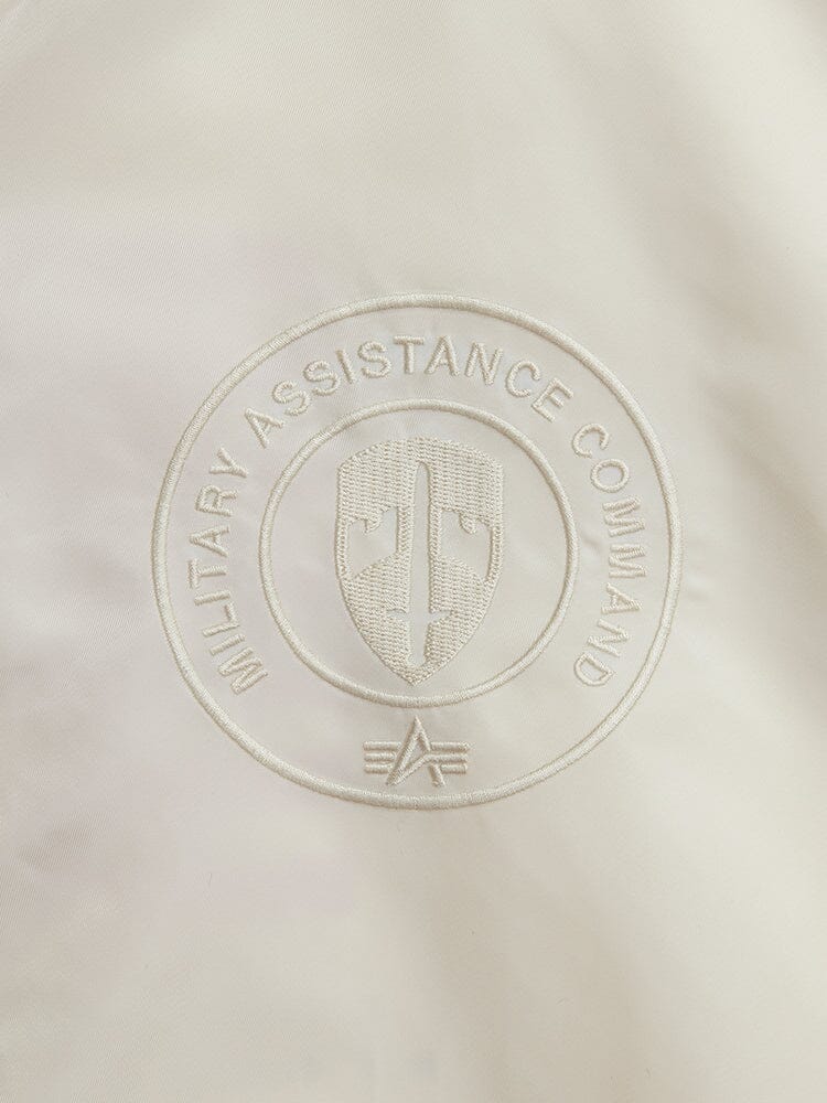 This bomber features a type of flag once sewn into the linings of jackets that contained a message in several languages to identify U.S. pilots who were shot down. It also features military assistance command embroidery on the chest and is made from lightweight flight nylon.