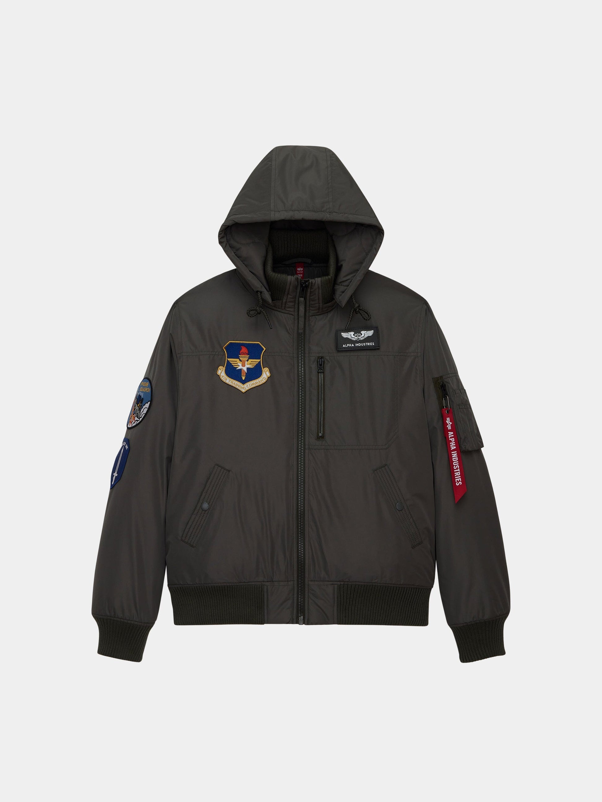 The Patched Hooded Rib Flight Jacket blends heritage aviation details with street-ready design. Made from polyester with cotton-blend panels, it features rib knit trim for structure and a drawcord hood for adaptable coverage. Functional welt pockets and a utility sleeve pocket with red ribbon keep essentials close, while embroidered, military-inspired patches on the chest and sleeve add standout style.