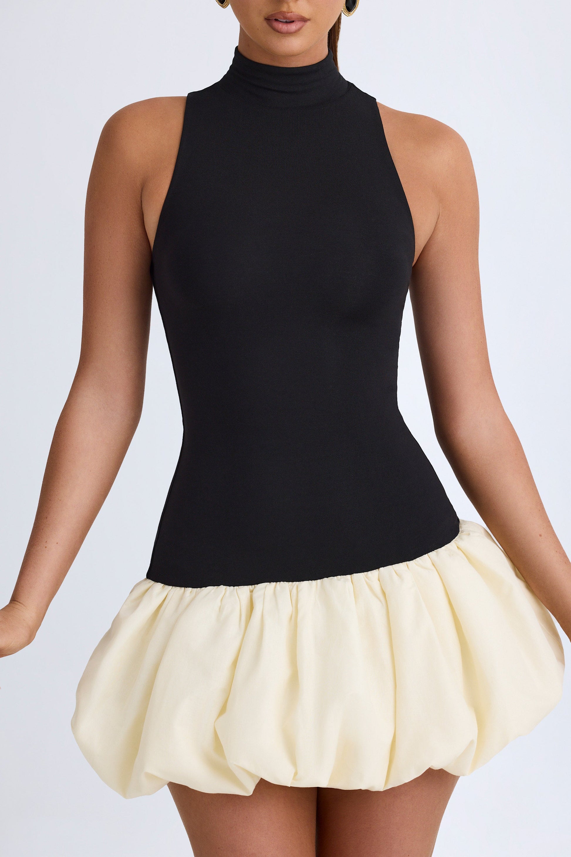 Captivating silhouettes. Perfectly tailored for a seamless fit, the Nabila mini dress features a drop-waist bodice crafted from figure-hugging stretch jersey made with TENCEL™ Modal fibres and a bubble-hem skirt made from cotton voile that creates a voluminous look. It’s framed with a classic turtleneck and primed for styling with point-toe heels for dinner plans.