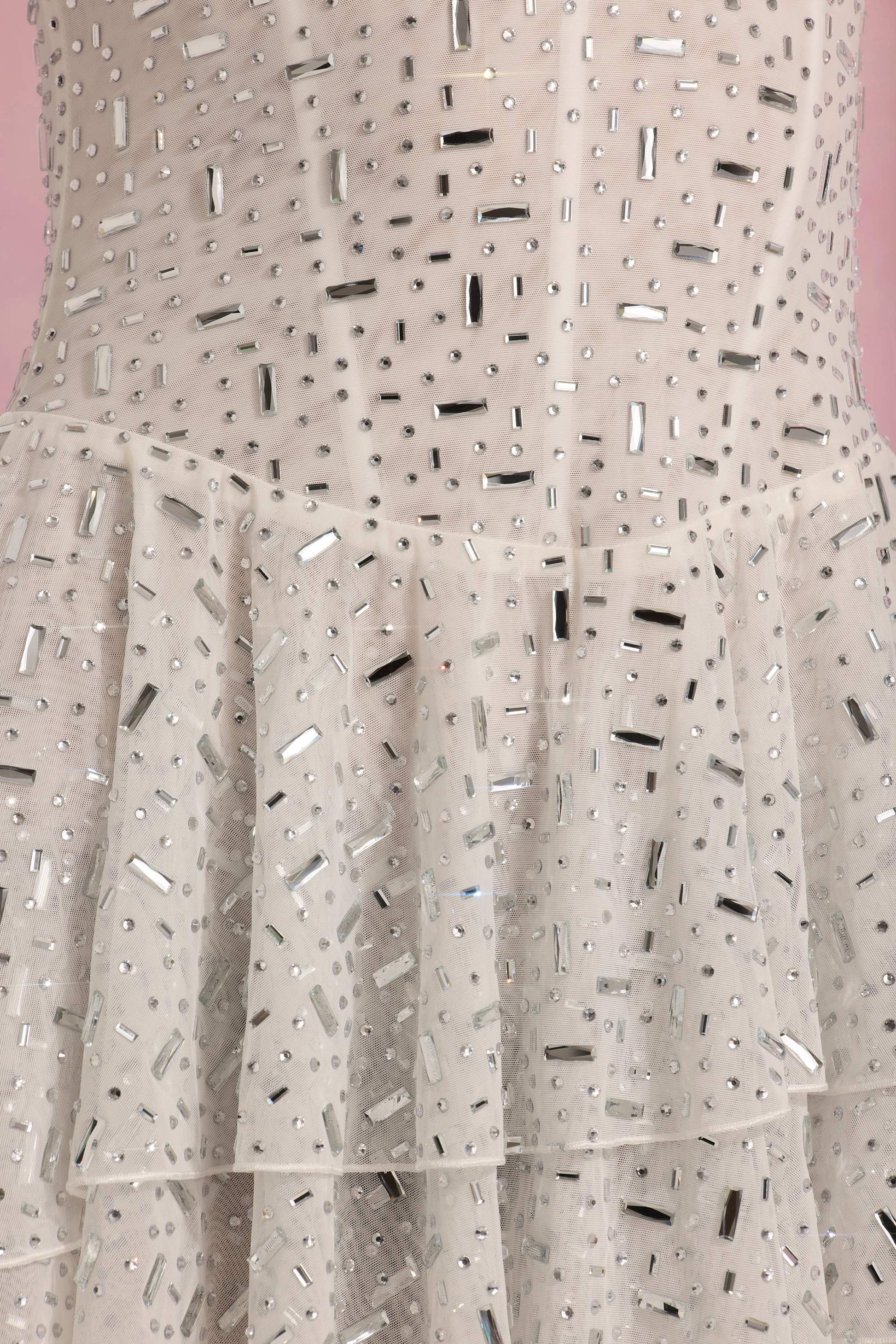 Embellished Ruffled Tiered Mini Dress in White