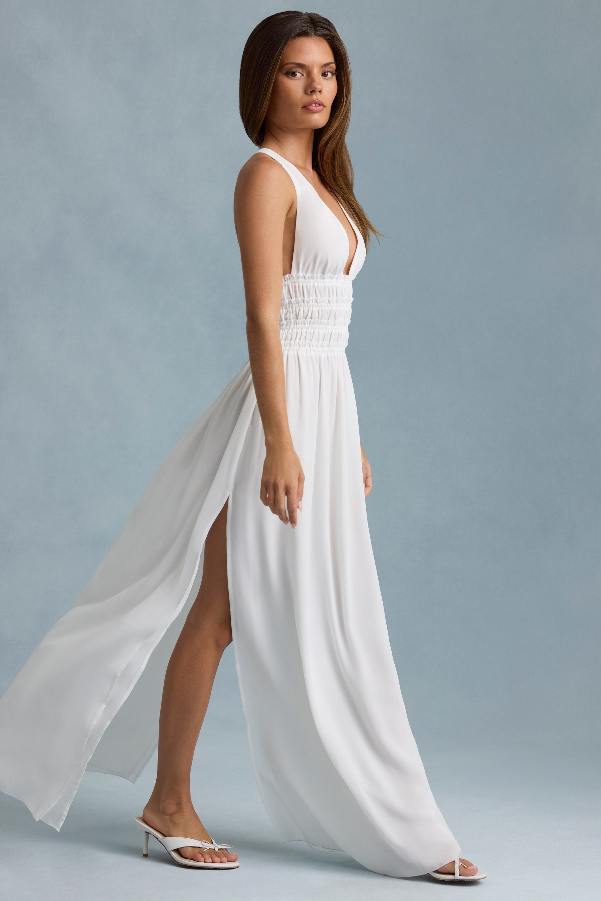 Daytime classics. Cut from lightweight and breezy georgette that pairs well with warm destinations, the Pryana maxi dress is cut to a relaxed column silhouette. It’s framed with a plunging V-neckline, a universally flattering shirred bust for comfort, and adjustable cross-back straps.