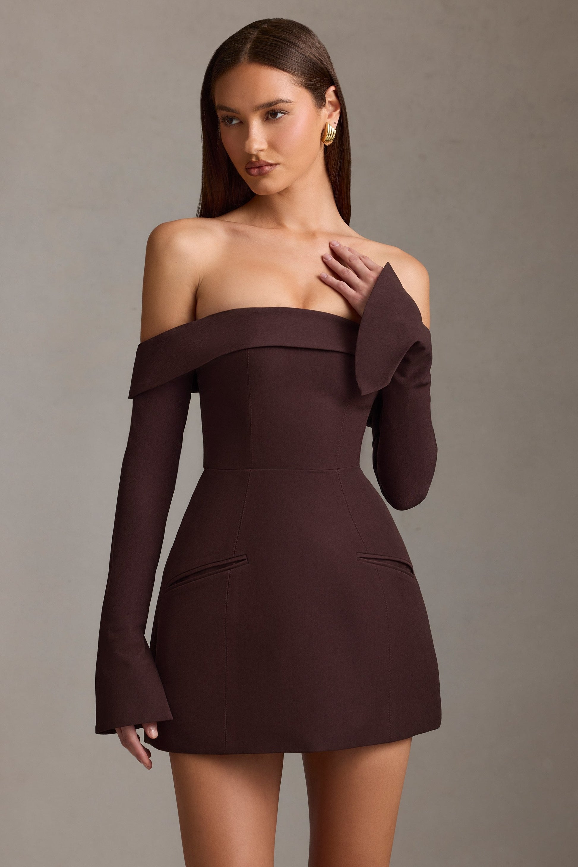Off-Shoulder Structured A-Line Mini Dress in Chocolate Brown